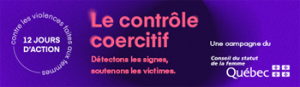 Le Conseil du statut de la femme (CSF) poursuit un objectif de sensibilisation sur la thématique du contrôle coercitif qui se définit comme un continuum de violence, d’exploitation, d’humiliation et de manipulation exercées de façon répétitive par son auteur et visant à établir et à maintenir une forme de domination sur sa victime dans le but de la priver de ses droits.