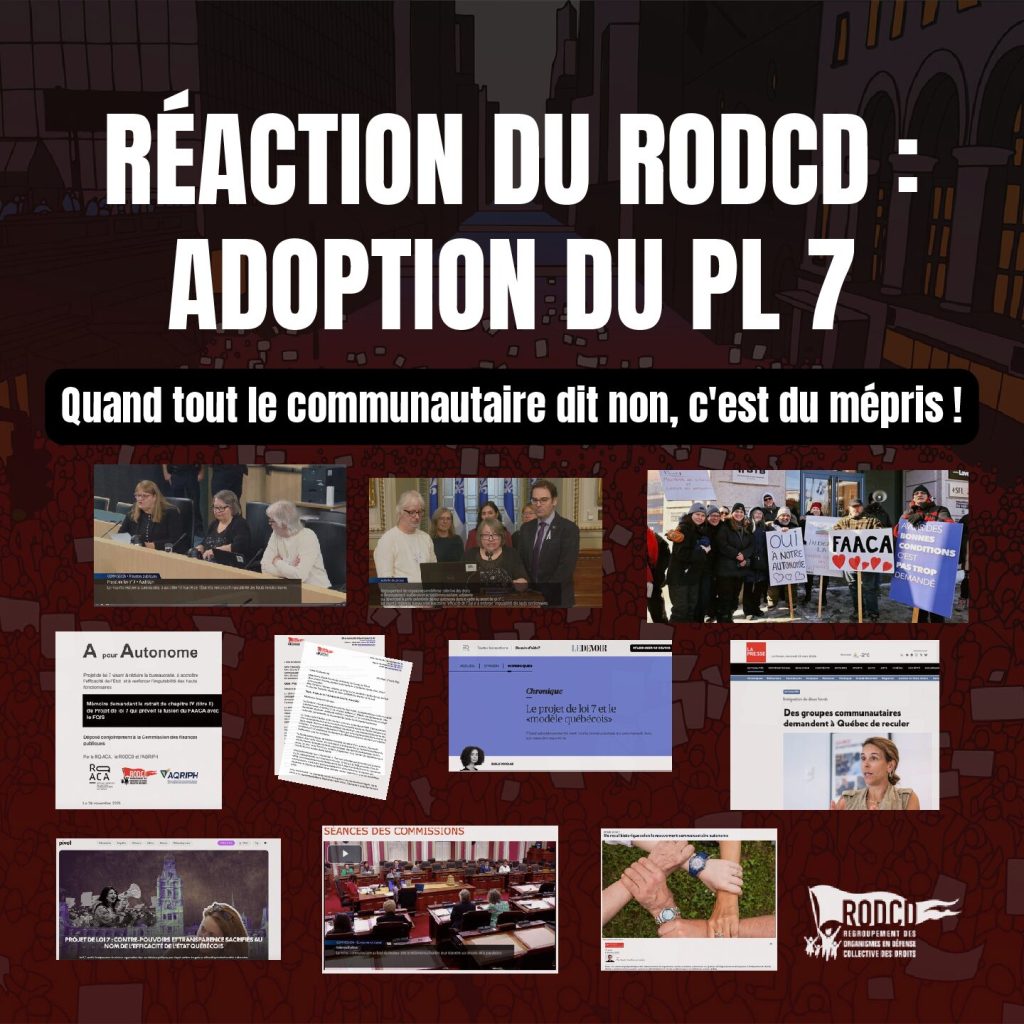 Avec le projet de loi 7 maintenant adopté, le Regroupement des organismes en défense collective des droits (RODCD) dénonce encore une fois ce recul historique touchant l’autonomie des organismes en défense collective des droits (DCD) d’abord, mais également l’ensemble de l’action communautaire autonome.
