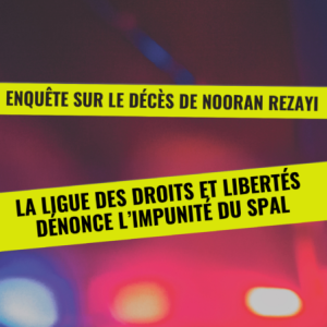 La Ligue des droits et libertés (LDL) dénonce fermement le non-respect des obligations légales et réglementaires du directeur du Service de police de l’agglomération de Longueuil (SPAL), Patrick Bélanger, et de plusieurs policiers du SPAL, concernant l’enquête du Bureau des enquêtes « indépendantes » (BEI) sur le décès du jeune Nooran Rezayi, 15 ans, abattu par un policier le 21 septembre.