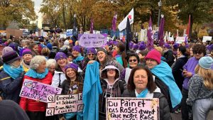 Nous étions plus de 20 000 personnes à Québec. L’ouverture de ce grand événement solidaire a été faite par des femmes des Premières Nations. Les nombreuses prises de paroles ont été percutantes, pleines de sens et d’espoir. Nous avons marché, chanté, dansé, pleuré, écouté et partagé toutes ensemble pour l’élimination de la violence faite aux femmes, l’élimination de la pauvreté et la protection de notre Terre Mère.