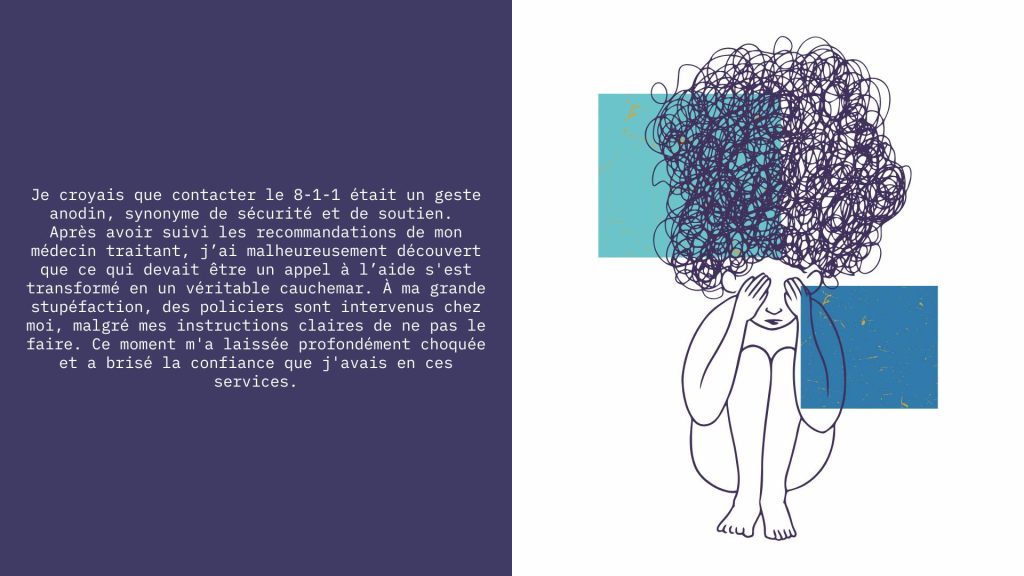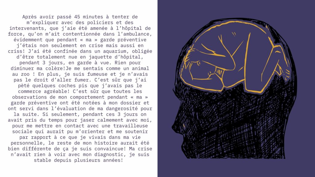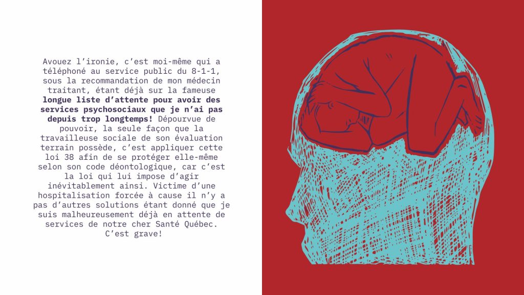 Les personnes qui subissent des hospitalisations forcées se heurtent souvent à un mur lorsqu’elles demandent de l’aide. Celles-ci demeurent sur la liste d’attente sans nouvelles, elles ne sont référées à aucune ressource, ou bien, dans le pire des cas, la P-38 devient la seule solution qui leur est offerte. De plus, au sein des urgences psychiatriques, l’aide et l’écoute dont ont besoin les personnes sont lacunaires, voire complètement absentes.